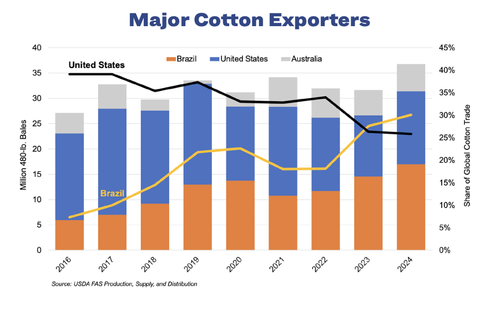 Brazilian cotton and soybean harvested acres have increased by 106% and 40%, respectively, since 2016.